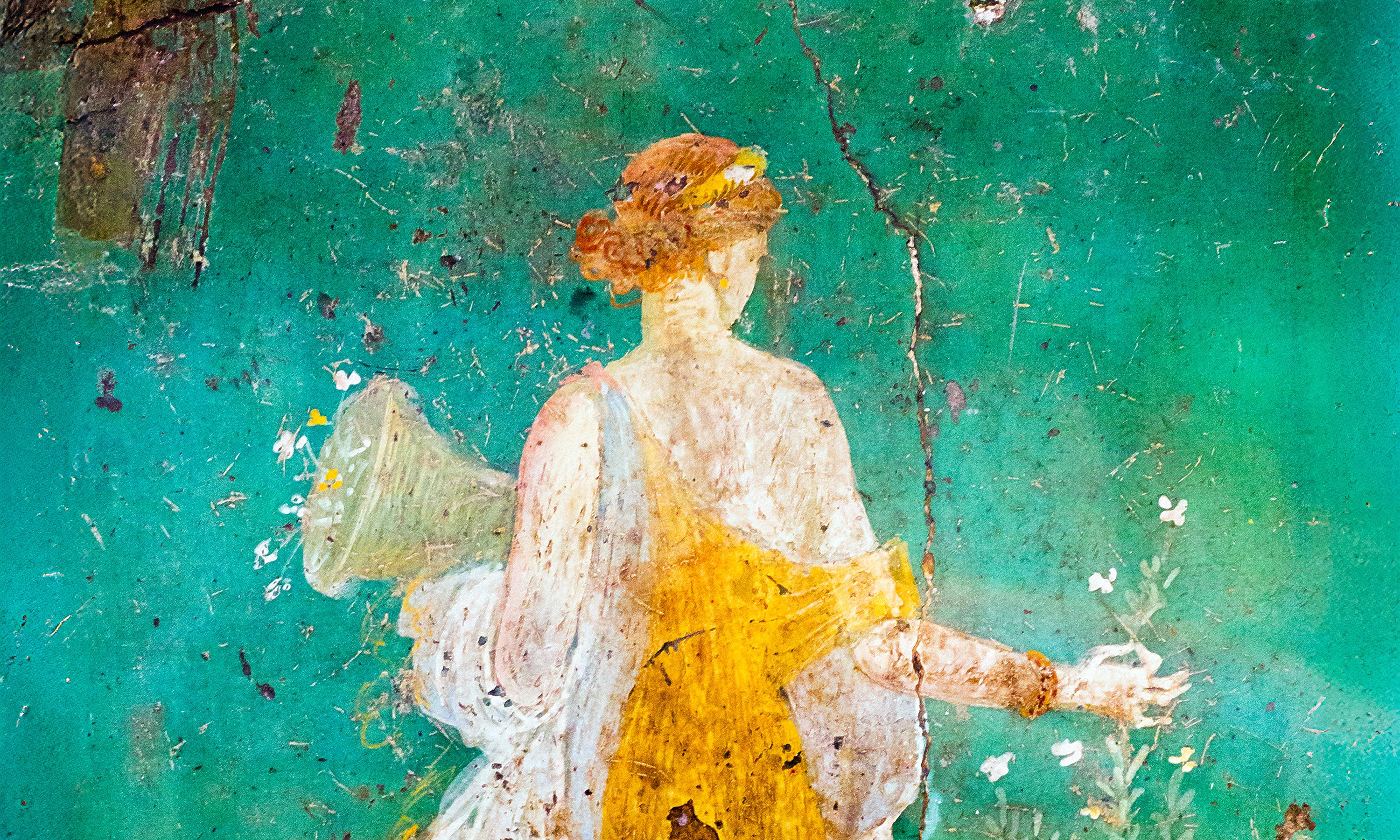 Ten starożytny rzymski fresk ze Stabiae przedstawia Florę, boginię kwiatów i wiosny, gracją pozującą na turkusowym tle, trzymając delikatne kwitnące gałązki. Jej płynące białe i złote szaty tworzą elegancką sylwetkę, która ucieleśnia boskie piękno odnowy natury.
